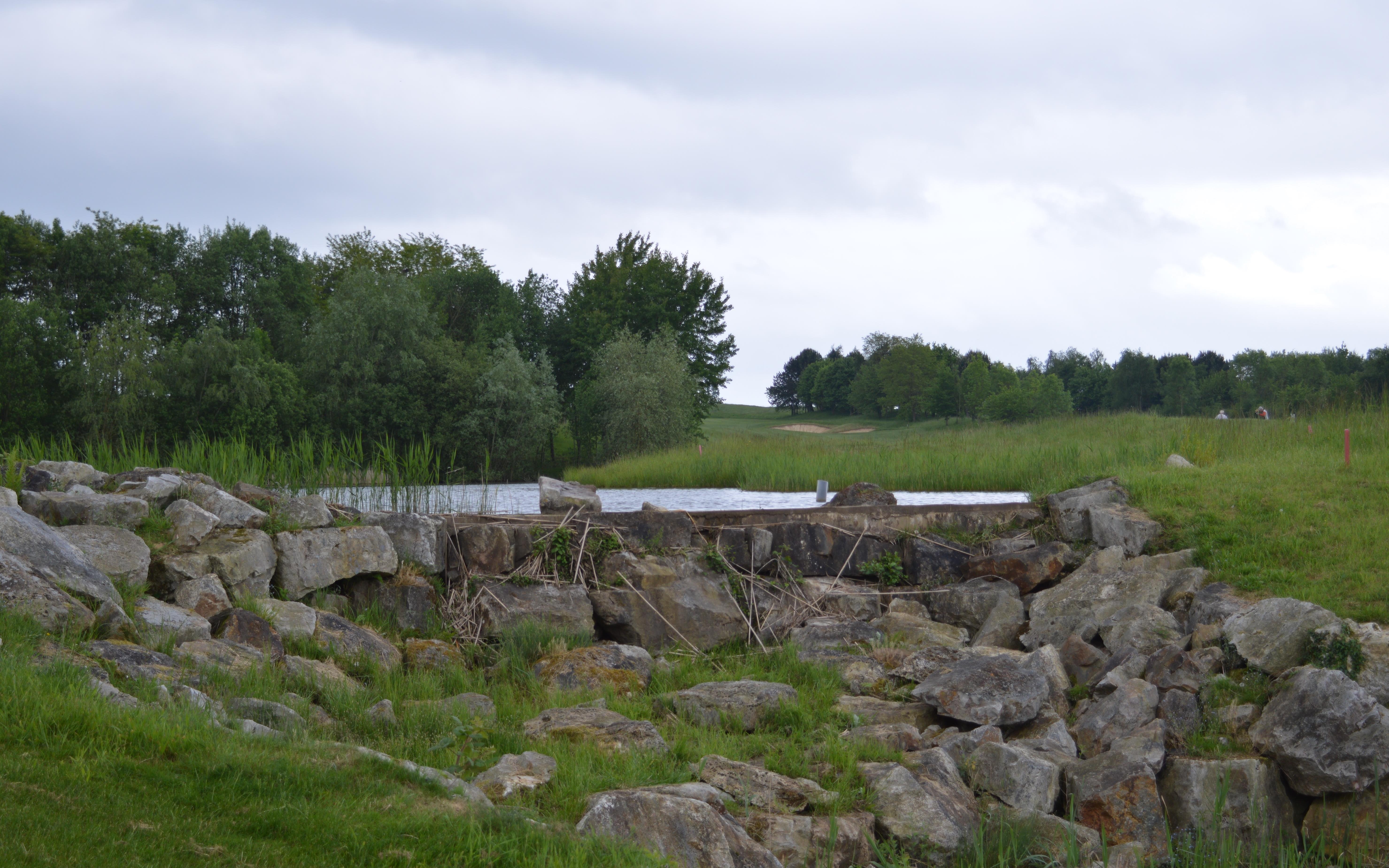 Nadat drie ballen in het water belanden, geven we het op. Wat een goeie matchplayhole!