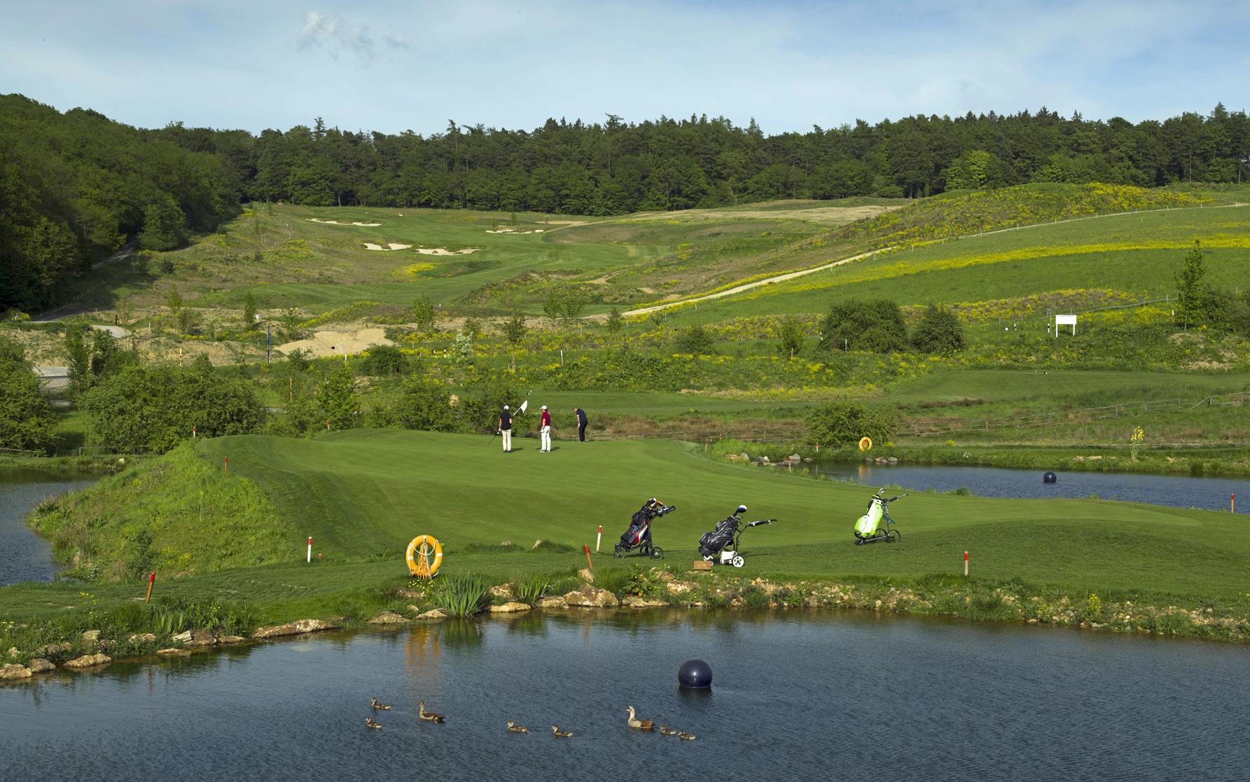 De Taunus is een fraai bosrijk middelgebergte in de Duitse deelstaat Hessen. Het gebied staat bekend om zijn bronnen, waardoor er veel kuuroorden te vinden zijn, maar je kunt er ook uitgebreid golfen op prachtige banen. We bezoeken het hotel en de gloednieuwe achttien holes van Hofgut Georgenthal in Hohenstein, halverwege Koblenz en Frankfurt am Main, op zo’n drieënhalf uur rijden van Utrecht. De historie van dit oude landgoed gaat terug tot 1692 en George August, graaf van Nassau-Idstein. In 1995 werd het Hofgut overgenomen door de familie Hankammer en verbouwd tot een wellnesshotel. Hoteleigenaresse is Brita Hankammer. Haar vader, eigenaar van de firma Brita (waterfiltratieproducten), heeft zo’n vermogen opgebouwd dat hij het complex onlangs kon uitbreiden met een bijzondere golfbaan. De eerste negen holes van Hofgut Georgenthal gingen vorig jaar open, in mei van dit jaar werden ze gevolgd door de tweede negen.