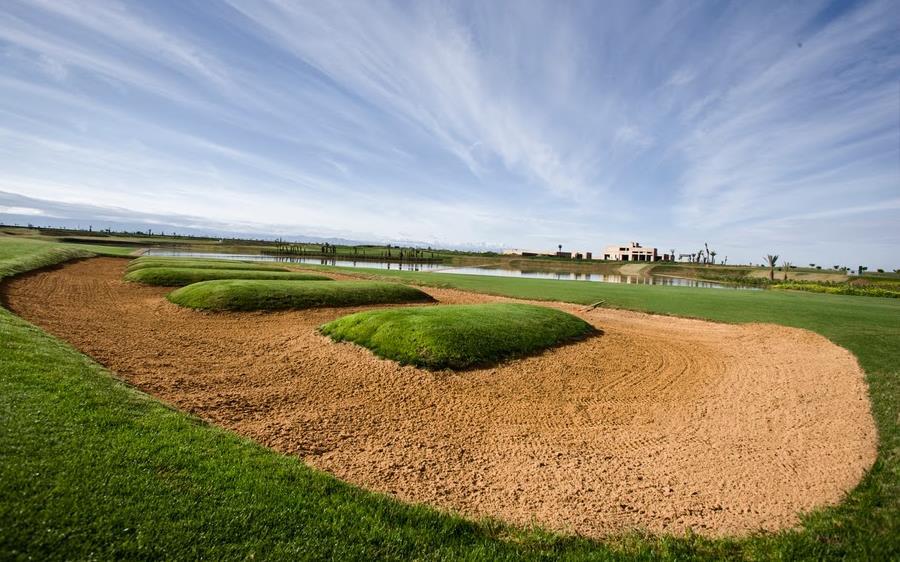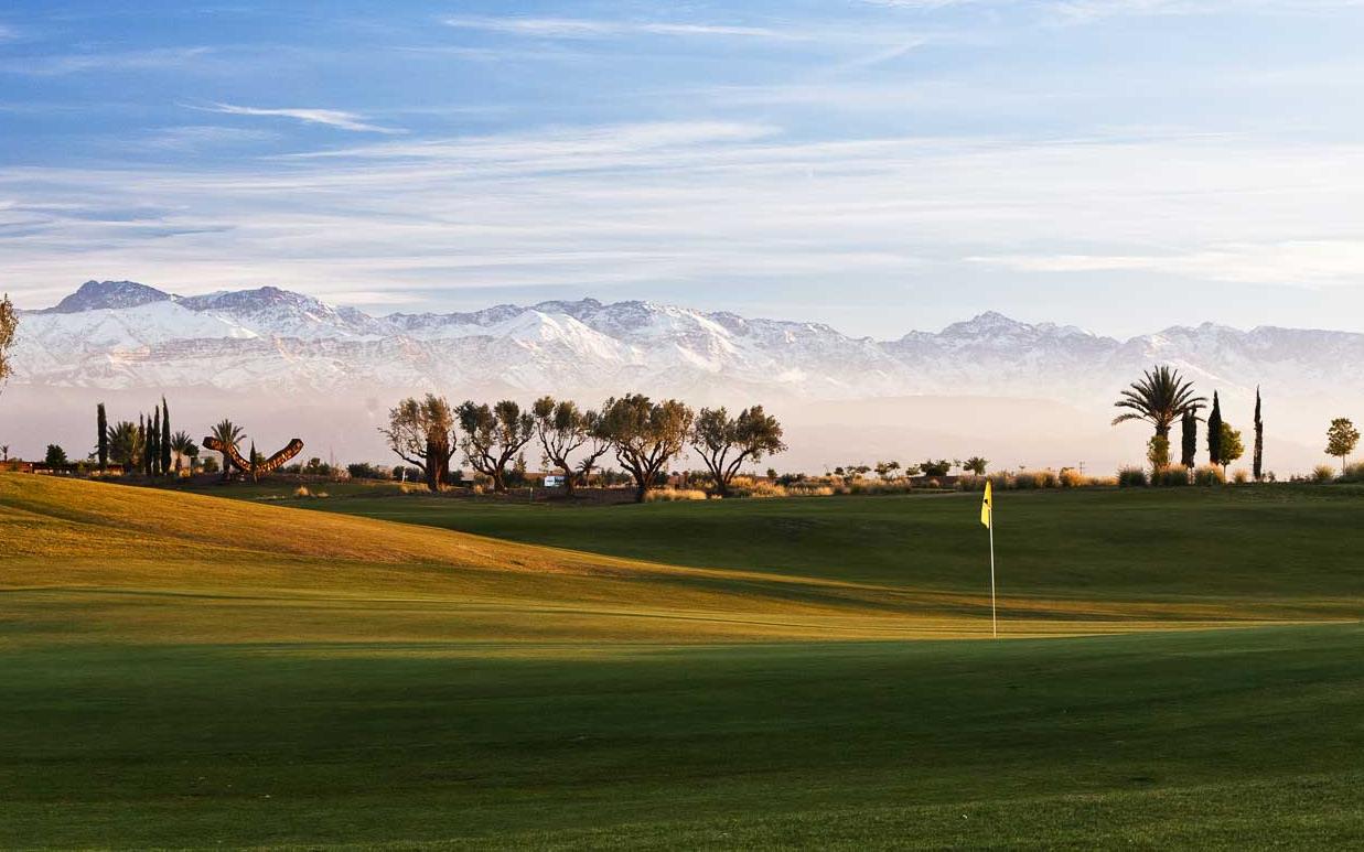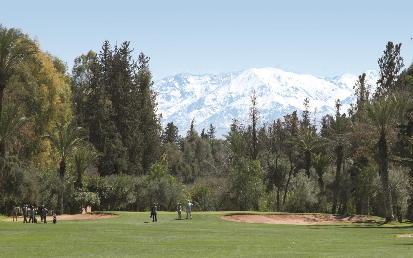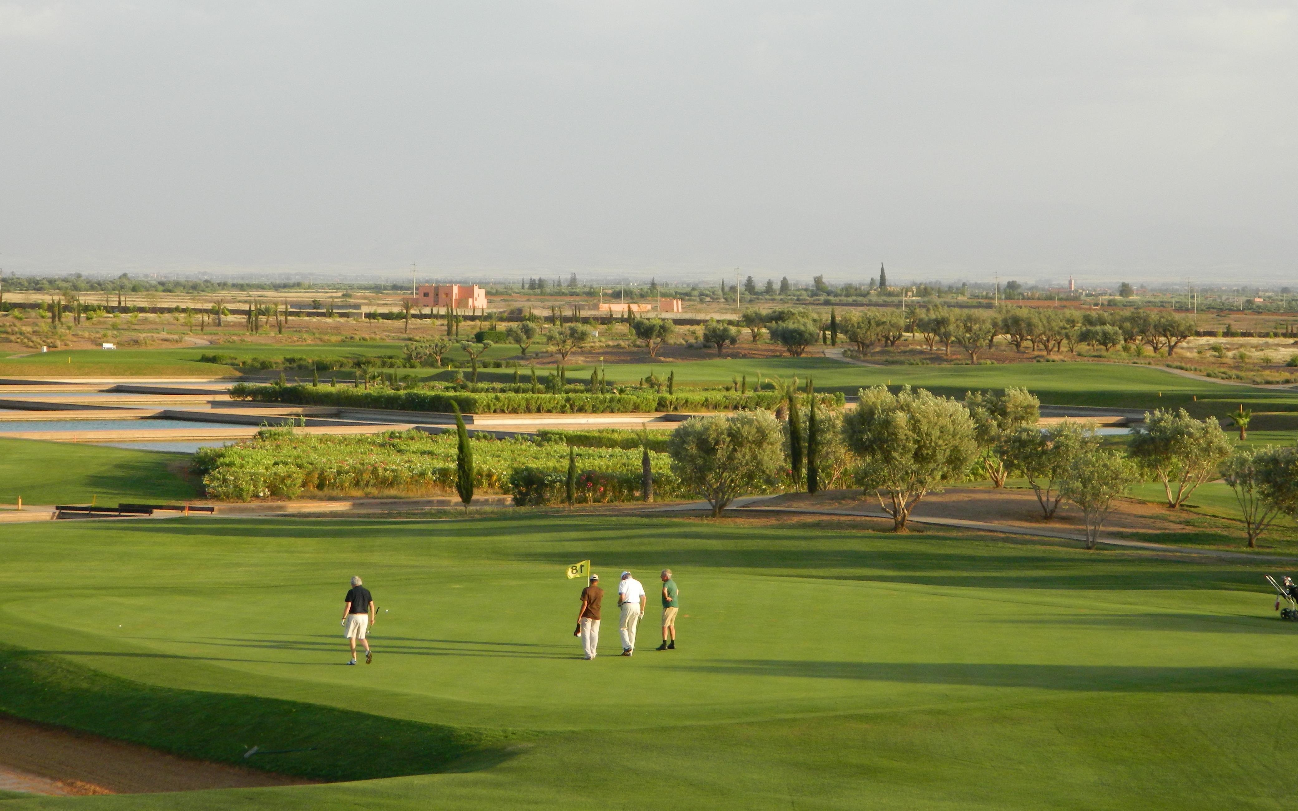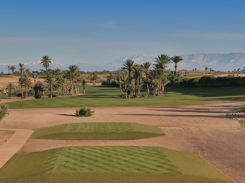 Een van de golfbanen die volgens insiders in financieel zwaar weer verkeert, is Samanah. Met het golf op deze course (signatuur Jack Nicklaus) heeft dat niets te maken, maar wel met het aangrenzende onroerend goed dat maar niet verkocht schijnt te raken. “De huizen zijn wel degelijk verkocht”, corrigeert caddiemaster Rachid streng. “Ze zijn alleen nog niet bewoond.” Deze typische desert course ligt op een steenworp afstand van Domaine Royal Palm. Om er te komen moet je de stadsgrenzen van Marrakech passeren en zie je kort het kale, maar indrukwekkende achterland van de Marokkaanse oase. Op de baan markeren witte stenen een afstand van 135 meter naar pin (150 yards) en stapeltjes stenen tonen de grens tussen baan en out of bounce. De holes zijn licht geonduleerd en worden opgesierd door verzorgde witte bunkers. De drivingrange en het eerste deel van de omloop liggen er heel droog bij. Echt hinderlijk is dat niet. Ik golf immers in de woestijn. Bij de green van hole zes zie ik een onverwachte vijver. Een van de drie, zo ontdek ik later. Alleen bij de approach naar de zestiende green en bij de afslag van de par-drie zeventiende zijn die waterhindernissen echt in het spel. Bij hole negen doemt er opeens een soort spookstad op van leegstaande (“maar wel verkochte”) villa’s, die even verder in bewoonde staat Samanah juist van extra allure voorzien. Al met al is Samanah geen moeilijke baan, tenminste als je de bunkers kunt omzeilen en de lijnen op de verraderlijke greens goed leest. Jammer dat het leegstaande vastgoed soms een wat onbestemd gevoel geeft, gelukkig rest altijd nog het magnifieke uitzicht over het Atlasgebergte en de comfortabele begroeting van het schitterende, bijna koloniaal aandoende clubhuis.
