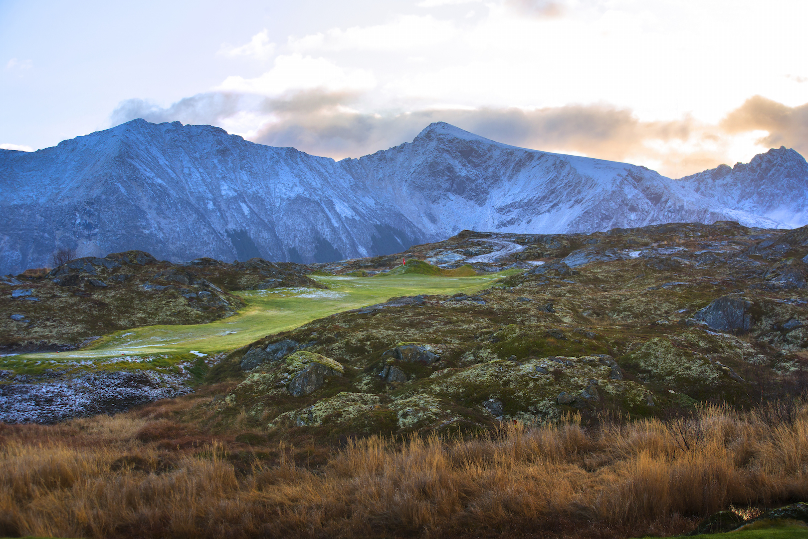 Onder grote belangstelling van pers vindt de opening plaats. De reacties zijn unaniem, iedereen is onder de indruk van het decor. Deze linkscourse lijkt niet op de banen in Engeland en Schotland. Geen strand en duinen, maar ruige natuur. Groene fairways met op de achtergrond hoge, besneeuwde bergen aan de linkerkant en rechts de azuurblauwe zee. Nadat het mediacircus met Suzann voorbij is, mogen we zelf de baan in. Het is elf uur in de avond, de zon gaat onder maar donker wordt het geen moment. Frode loopt met ons mee en dat is handig want je vindt niet zomaar de weg in deze Scandinavische woestenij. Hij kent de omgeving goed want behalve zijn golfbaan heeft hij een boerderij met 26 IJslanders. Gasten die even niet willen golfen, kunnen te paard de omgeving verkennen via oude Vikingpaden. De Lofoten Links heeft een goede lay-out, lange holes worden afgewisseld met korte en de hoogteverschillen zijn prima te overbruggen. Bij het betreden van de tee staan we vol bewondering te kijken naar de hole en soms wanen we ons op een andere planeet. We zijn het erover eens dat je hier niet komt voor één ronde, deze baan moet en wil je twee keer spelen.