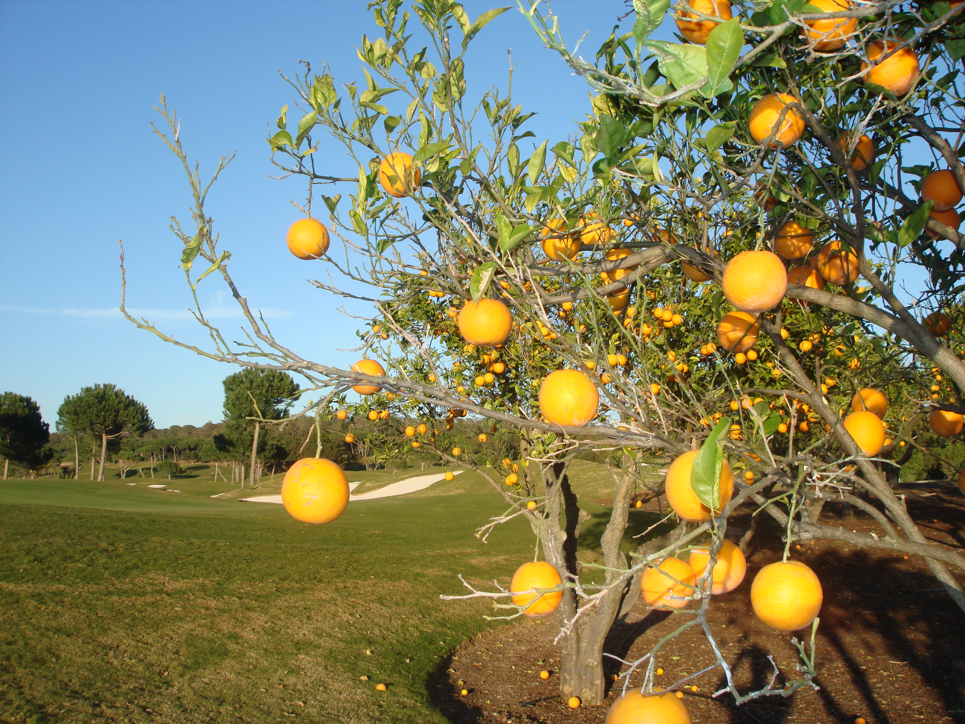 Over een uur worden we geacht op de tee te staan dus snel de auto weer in en een paar rotondes later zoeven we langs een haag van sinaasappelbomen richting Laranjal. Deze parkbaan is zeven jaar geleden geopend en aangelegd op het terrein van een voormalige sinaasappelkwekerij. Vanuit het kleine clubhuis is het open karakter goed te zien en ons vertrouwen groeit maar de manager tempert onze hoogmoed: “hier begint het golf pas op de green!” Hij geeft lachend een pitchfork en wenst ons veel succes. Komend vanuit de Nederlandse winter hebben we enige aanpassingen op de greens ingecalculeerd maar hier worden we een aantal keer verrast met lastige pinposities en onnodig gecreëerde ondulaties waardoor het eerder frustrerend is dan uitdagend. Laranjal is namelijk van tee tot green een leuke baan met genoeg interessante hindernissen. Een goed voorbeeld is hole elf, een par drie waarbij je van de tee een enorme partij bunkers ziet en rechts daarvan water. De green links valt daarbij nauwelijks op maar is gelukkig goed aan te spelen en daar komt het cadeau van de manager goed van pas.