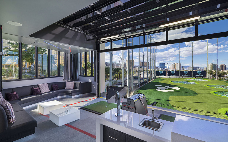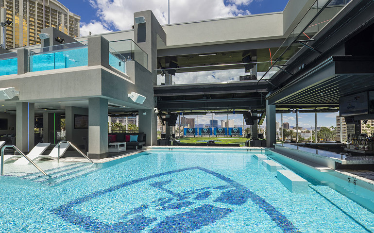 Als we met de taxi worden afgezet, wordt direct duidelijk dat dit not your average drivingrange is. De Amerikanen zijn heer en meester als het gaat om entertainment, en Topgolf vormt daarop geen uitzondering. We zijn in de nieuwste en grootste vestiging, in Las Vegas. Het moest ‘over the top’ worden en dat is aardig gelukt met vijf bars, twee zwembaden, VIP-suites, fitting studio, een merchandising shop en een podium met live muziek. Bij de receptie laten we ons voor vijf dollar registreren als nieuwe Topgolfers, inclusief persoonlijk pasje. We kunnen kiezen uit vier verdiepingen. De uurprijs hangt af van de verdieping (hoe hoger, hoe duurder) en het tijdstip. Voor een uurtje Topgolf betaal je op een zaterdagavond na zes uur, op de tweede verdieping, 75 dollar. Op een doordeweekse dag is dat in de ochtend slechts 30 dollar.