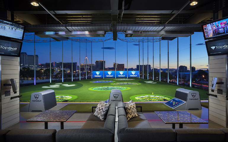 Elke bay biedt ruimte aan maximaal zes personen. Piekuur of niet, het publiek weet Topgolf te vinden, want we moeten driekwartier wachten. Alle 108 bays zijn bezet en er is een wachtrij, die op andere locaties op kan lopen tot drie uur. Erg is het niet, want als we de grote ruimte richting de afslagmatten binnenlopen, staat daar een grote bar en een nog groter tv-scherm. Het is afgeladen vol en gezien de beperkte speelcapaciteit is een deel van de bezoekers er ongetwijfeld om alleen een drankje te drinken voor de gezelligheid en de goede sfeer. Het is de ideale stop voordat je je overgeeft aan het andere entertainment van Las Vegas. Het zwembad laten we voor wat het is en we kijken onder het genot van een biertje naar sport en de mensen om ons heen. Het is gezellig bij Topgolf en we wanen ons meer in een nachtclub (sluitingstijd is drie uur ’s nachts) dan op een drivingrange.